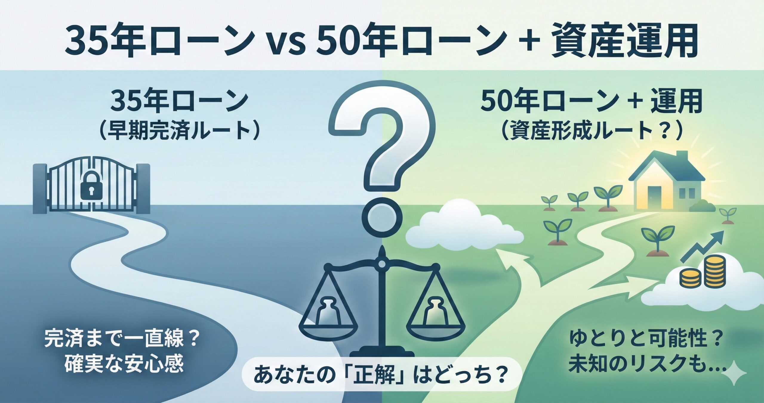 「35年で確実に完済を目指す道」と、「50年かけてリスクを取りながら資産形成を狙う道」。