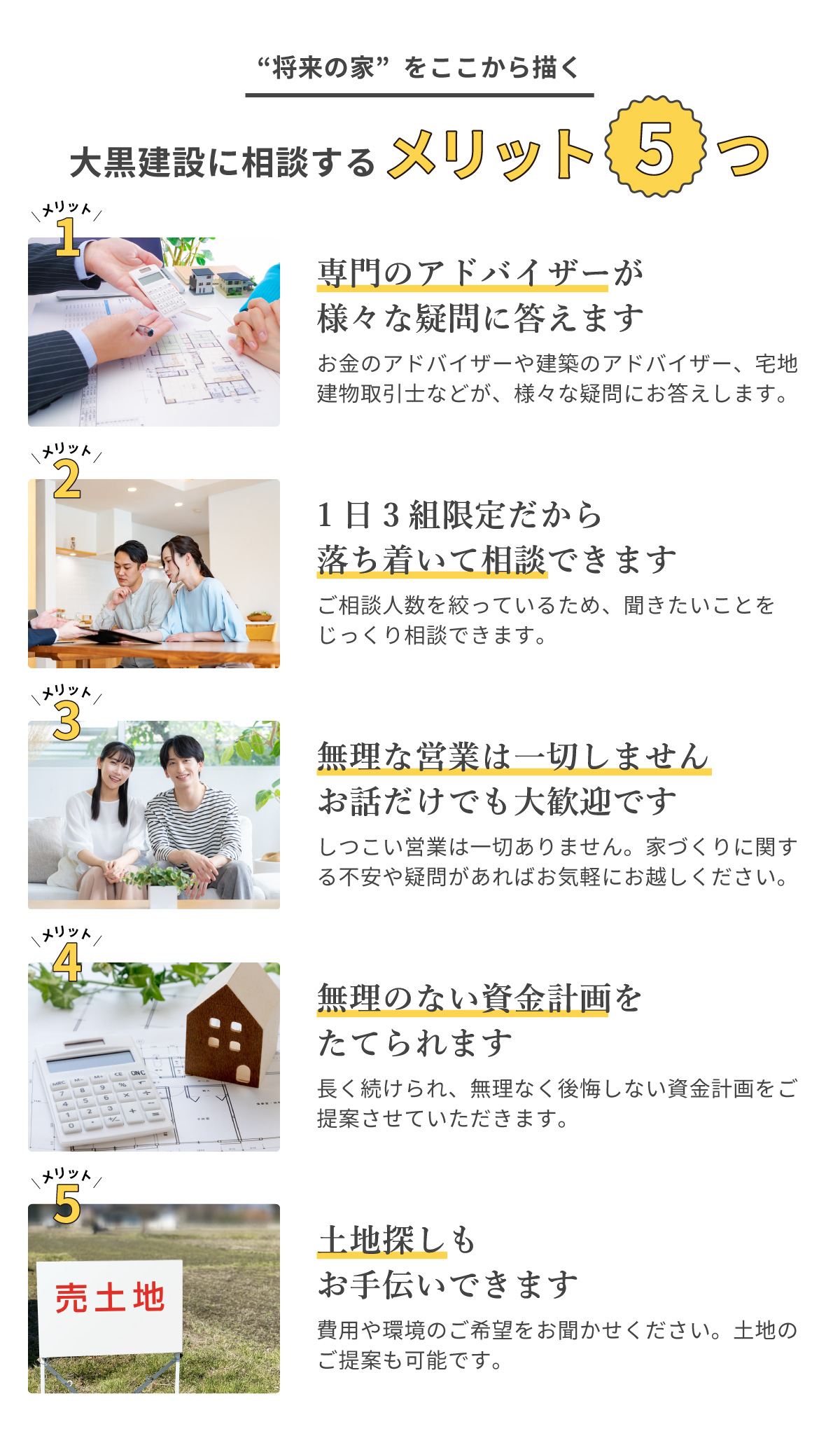 「これからどんな人生を歩みたいか」というお話をじっくり伺い、ご希望と将来の収支バランスから無理のない資金計画をご提案します。一時的な満足ではなく未来への安心を優先するのが大黒建設の家づくりです。