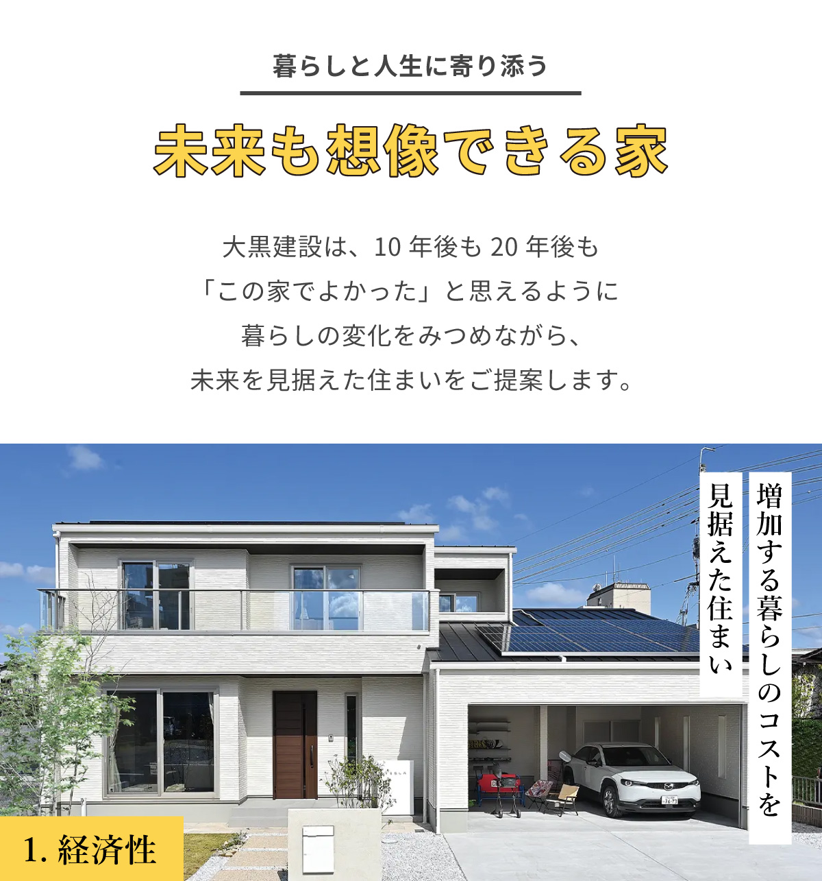 大黒建設では、太陽光発電をはじめ省エネ設備を標準装備とすることで、電気代の負担を軽減し、将来の家計に優しい暮らしを実現しています。