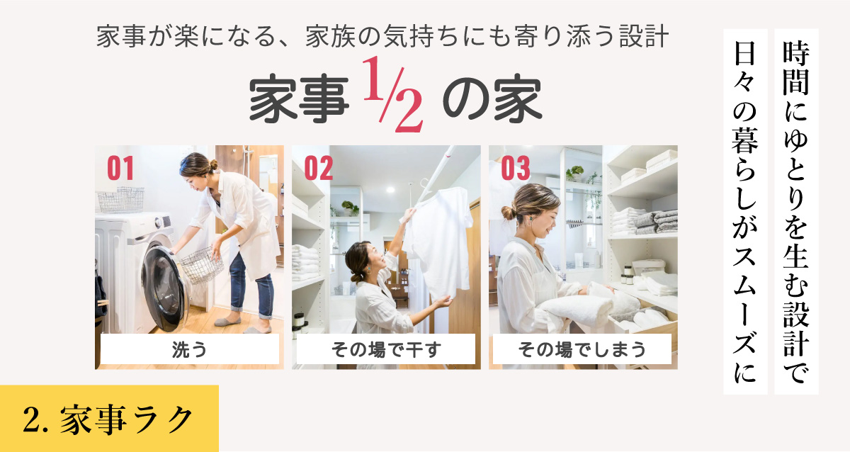 洗濯・料理・掃除など、家の中で何百回も繰り返家事動線動に、少しの工夫を加えることで、時間にも気持ちにも、ゆとりが生まれます。
