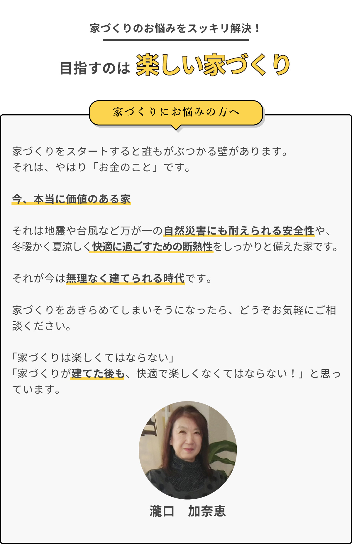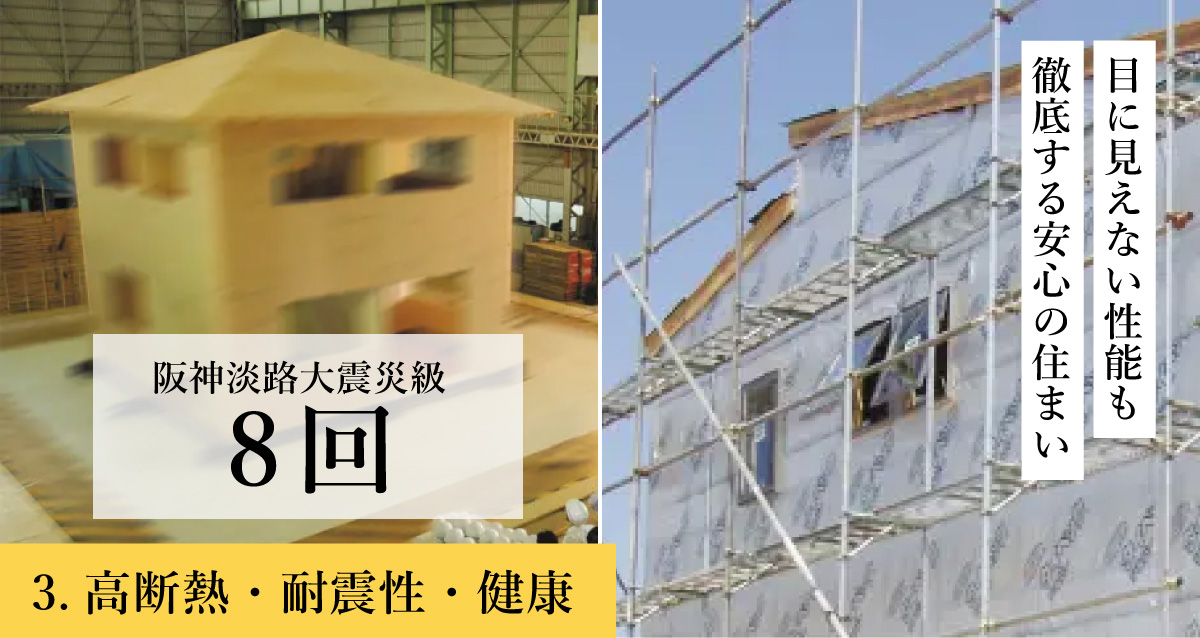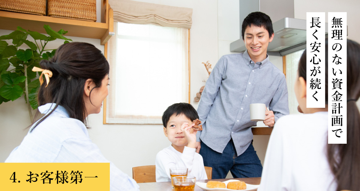 家は大切な家族を守り、健康と快適さを育む場所です。気密性・断熱性・耐震性などをオプションではなく“標準仕様”とし、安心できる家づくりを大切にしています。