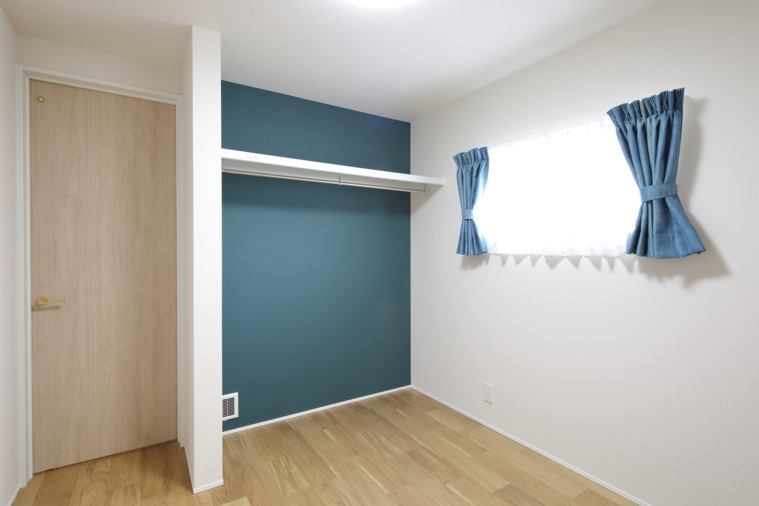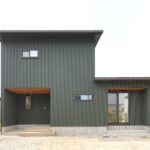 深みのあるモスグリーンのガルバリウム外壁に、木目の軒天がアクセントを添えるモダンな佇まい。 このお住まいの最大の特徴は、**「1階に主寝室を配置した間取り」**です 。 夫婦の生活スペースをすべて1階に集約することで、将来は階段の上り下りがない「平屋のような暮らし」が可能になります。