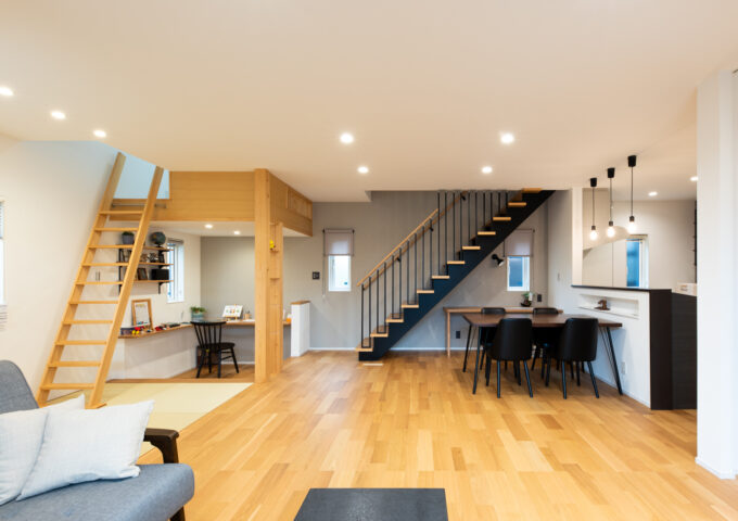 勾配天井とリビング階段で開放感のある家